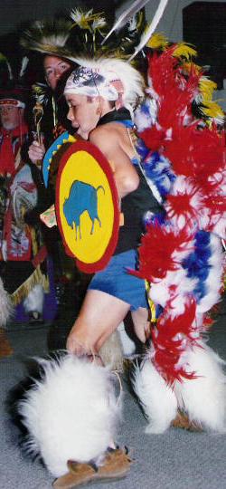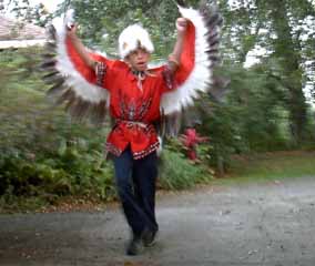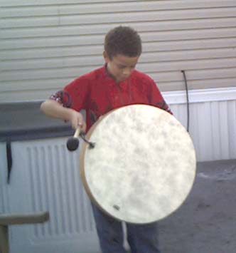 | His Cherokee-style regalia | Beating his own drum |