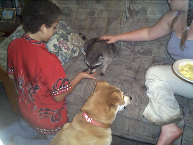 | Feeding Ziggy the racoon | Hanging out with some of the Wolf clan warriors |
