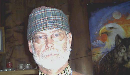 A Cherokee-style turban. The cloth style was chosen to signify my Scotch-Irish heritage.